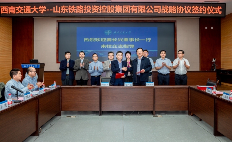 在西南交通大學(xué),校長楊丹對姜長興一行表示歡迎,對雙方開展戰(zhàn)略合作給予充分肯定,并希望在科技成果轉(zhuǎn)化、人才培養(yǎng)等方面開展深度合作。科研院副院長、川藏辦副主任王鷹教授介紹了學(xué)校情況和科研工作情況,產(chǎn)業(yè)處、土木工程學(xué)院、電氣工程學(xué)院、牽引動力國家重點(diǎn)實(shí)驗(yàn)室、交通運(yùn)輸物流學(xué)院、交大設(shè)計(jì)院、唐源電氣、運(yùn)達(dá)科技、鐵發(fā)公司等負(fù)責(zé)人分別介紹了情況,并就雙方可能合作的領(lǐng)域進(jìn)行了交流,在科技成果產(chǎn)業(yè)化、產(chǎn)業(yè)合作等方面形成了共識。姜長興在講話中指出,與西南交大開展戰(zhàn)略合作協(xié)議,是雙方落實(shí)習(xí)近平總書記科技強(qiáng)國、交通強(qiáng)國重要論述的具體行動。西南交大技術(shù)底蘊(yùn)厚、創(chuàng)新能力強(qiáng)、科技轉(zhuǎn)化率高,很多新技術(shù)、新材料業(yè)內(nèi)領(lǐng)先。山東鐵投擁有龐大的鐵路建設(shè)市場,愿意成為西南交大的“露天實(shí)驗(yàn)室”,雙方合作大有可為。會上,姜長興同志、楊丹同志分別代表雙方簽訂戰(zhàn)略合作協(xié)議,并向何川、楊榮山等五位專家頒發(fā)聘書。