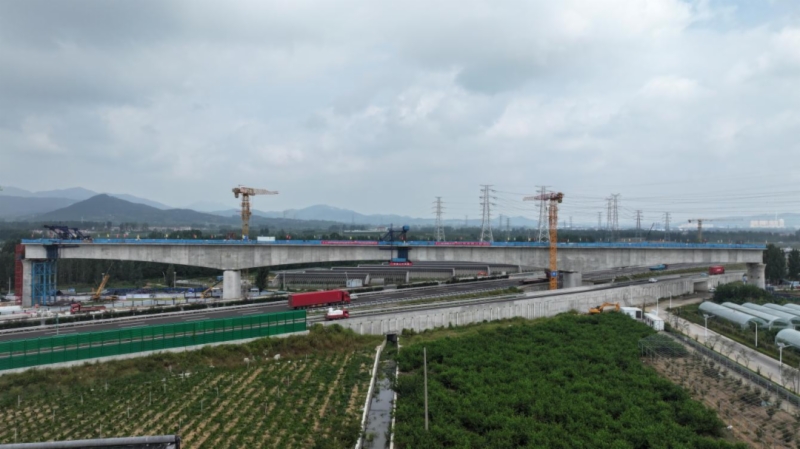 9月14日,全長272米、總重超1.7萬噸的濰宿高鐵至青島連接線(以下簡稱青島連接線)西風河特大橋跨沈海高速連續梁順利合龍,這是青島連接線全線最大跨度連續梁。
