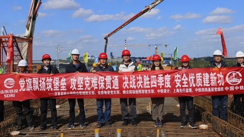 在澆筑現場,煙臺交通“黨建+”共同體還同步開展了“黨旗飄揚筑堡壘 攻堅克難保貫通 決戰決勝四季度 安全優質建新功”主題黨日活動,各支部黨員代表共同見證連續梁澆筑過程,從火熱的建設實踐和攻堅克難的奮斗精神中汲取力量,進一步激發“建功在一線”的昂揚斗志。