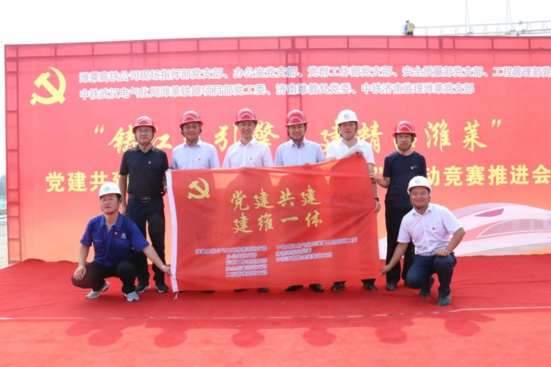 為慶祝中國(guó)共產(chǎn)黨成立99周年,掀起濰萊高鐵四電施工大干熱潮,7月2日,濟(jì)青高鐵公司辦公室黨支部、黨群工作部黨支部、工程管理部黨支部、安全質(zhì)量部黨支部、現(xiàn)場(chǎng)指揮部黨支部,聯(lián)合中鐵武漢電氣化局濰萊項(xiàng)目部黨工委、濟(jì)南維管處黨委、青島維管段黨工委、中鐵濟(jì)南監(jiān)理濰萊黨支部,開(kāi)展“鑄紅色引擎,建精品濰萊”黨建共建暨“百日大干”勞動(dòng)競(jìng)賽推進(jìn)活動(dòng),形成合力打造高鐵工程“建維一體”化。