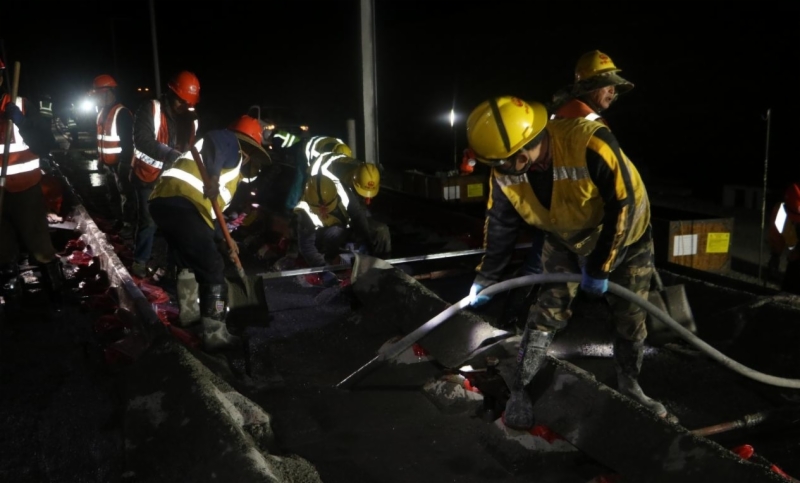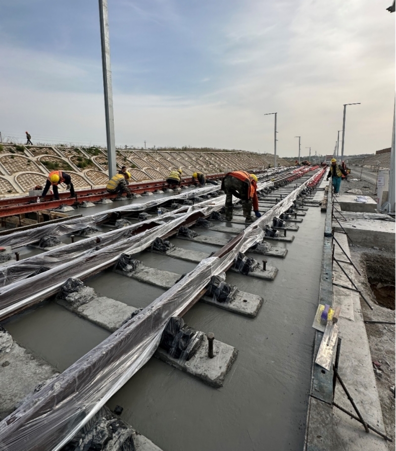 濰煙鐵路正線全長237.3公里,區(qū)間鋪軌473.832公里,站線鋪軌28.28公里,道岔鋪設(shè)100組,本次澆筑的60-18號5.0m線間距單開渡線道岔位于鋪軌起點蓬萊市站,道岔區(qū)結(jié)構(gòu)全長166.658米。為按時完成澆筑,濰煙公司組織參建單位以黨建促生產(chǎn),以一線指揮部黨支部為戰(zhàn)斗堡壘,發(fā)揚黨員先鋒模范作用,提前籌劃,優(yōu)化資源配置、明確職責(zé)分工,研究技術(shù)措施,督導(dǎo)參建人員做好崗前培訓(xùn)及技術(shù)交底,落實施工前的各項準(zhǔn)備工作,同時加強過程管控的力度,確保了首組無砟道岔安全優(yōu)質(zhì)的完成。此次施工節(jié)點的順利完成,為后續(xù)長軌鋪設(shè)作業(yè)奠定了基礎(chǔ),為無砟道岔施工積累了經(jīng)驗。
