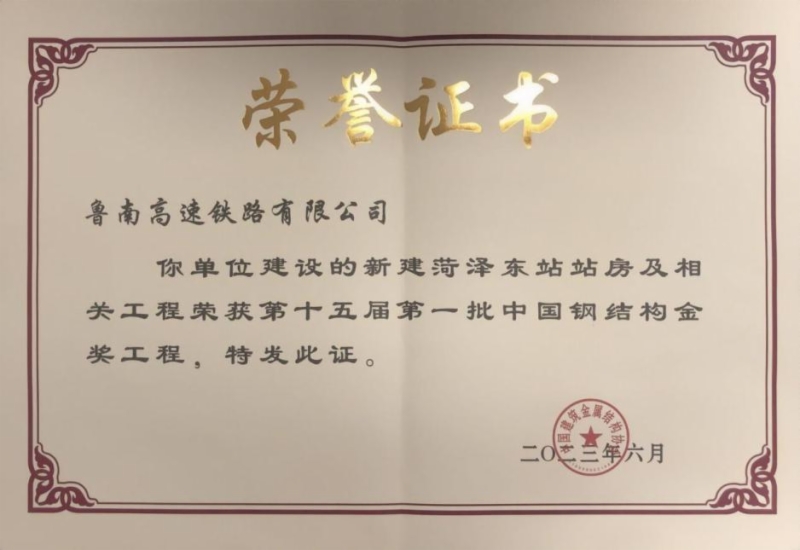 近日,魯南高鐵菏澤東站,榮獲“第十五屆第一批中國鋼結構金獎”。