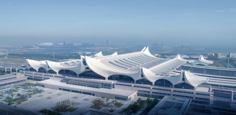濟青高鐵紅島站位于青島市城陽區,是濟青高鐵設計終點站,站房面積7萬平方米,采用線上式布置,由下至上分別為出站層、廣場層、站臺層、高架候車層及旅服夾層,建筑總高度52.993m。紅島站站場設計規模10臺20線,是山東省第二大,青島市最大的高鐵站。