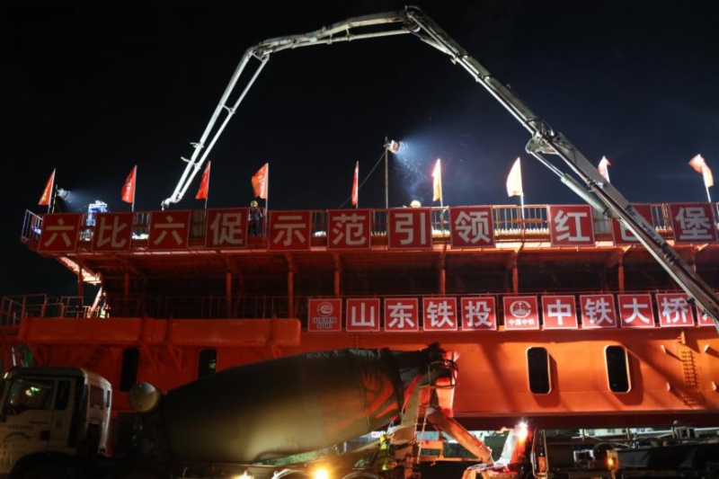 為確保此次澆筑順利完成,濟濱高鐵公司堅持嚴要求、高標準施工,組織項目部合理配置資源,先后召開移動模架專項施工方案專家評審會、移動模架專項施工方案技術研討會,為現(xiàn)場施工提供技術支撐。創(chuàng)新工藝工法,采用移動模架施工,機械化程度高、結構受力明確,實現(xiàn)了連續(xù)循環(huán)作業(yè),滿足技術、經(jīng)濟、結構和運行穩(wěn)定性、施工方便性等各方面的要求。此外,單孔施工周期短、安全質(zhì)量可控,既節(jié)省了勞動力、降低了勞動強度,還大大減少了對土地占用以及對生態(tài)環(huán)境的破壞。充分發(fā)揮濟濱高鐵黨建聯(lián)盟優(yōu)勢作用,黨員先鋒隊、青年突擊隊精心組織、超前謀劃,不斷優(yōu)化施工方案,多次開展專項培訓和技術交底,有力彰顯了黨支部戰(zhàn)斗堡壘和黨員先鋒模范作用。