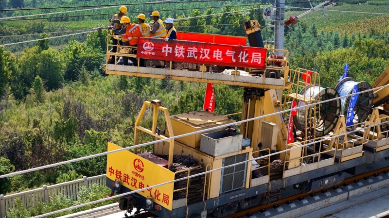 接觸導線直接承擔著為列車提供強大電力來源的重任,列車通過受電弓從接觸網上直接取電,獲得行駛動力。濰煙高鐵需架設接觸網629.46條公里,在導線架設中,統一采用恒張力放線車施工,確保導線的平直誤差不超過0.1毫米。